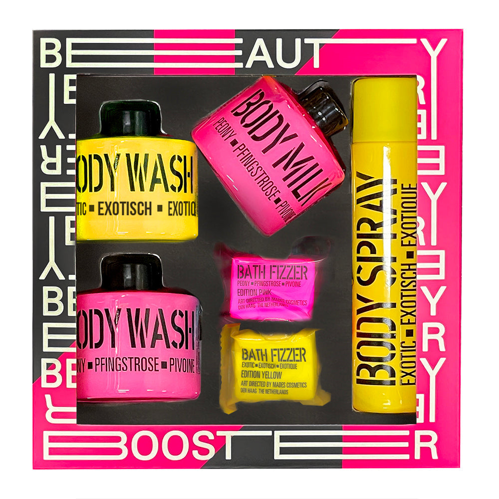 Набір: гель для душу х2, молочко для тіла х1, спрей для тіла х1, шипуча таблетка для ванни х2 EXOTIC YELLOW & PEONY PINK