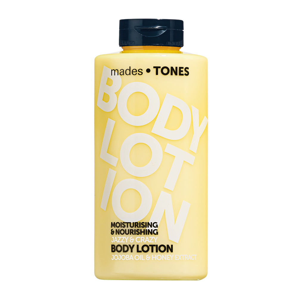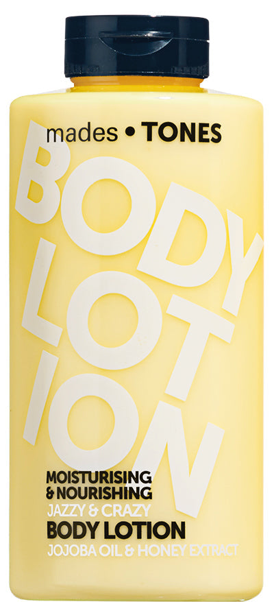 Вишуканий лосьйон для тіла з екстрактом меду Jazzy&Crazy Body Lotion з колекції Tones від Mades Cosmetics неймовірно зволожує та живить шкіру, стимулюючи оновлення клітинного складу епідермісу. Професійний засіб має тонізуючу дію, усуває сухість і лущення, стягнутість шкірного покриву. Після застосування лосьйону шкіра стає м'якою і гладенькою, ніжною і шовковистою. Основні діючі речовини формули: мед, олії жожоба, мигдалю та арганова олія. Легка консистенція засобу швидко вбирається, не залишаючи на поверхні шкіри липкої плівки й жирного блиску. Парфумерна композиція Jazzy&Crazy Body Lotion – це розкішні пахощі екзотичних фруктів з акордами солодкої карамелі.