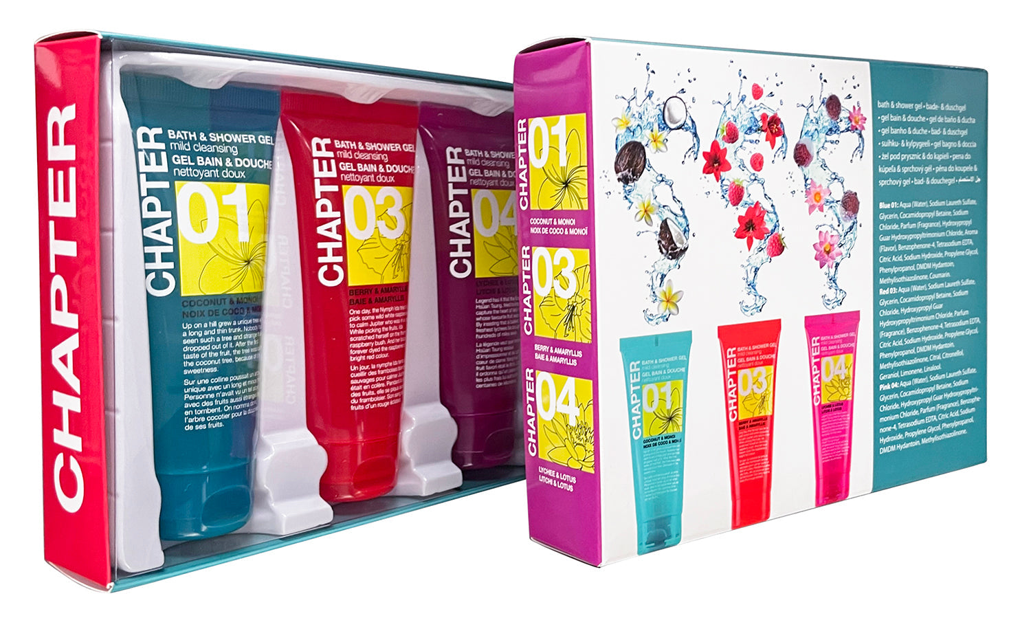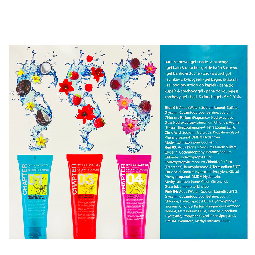 Набір для подорожей 01: гель для душу x3 CHAPTER coconut & monoi / berry & amaryllis / lychee & lotus
