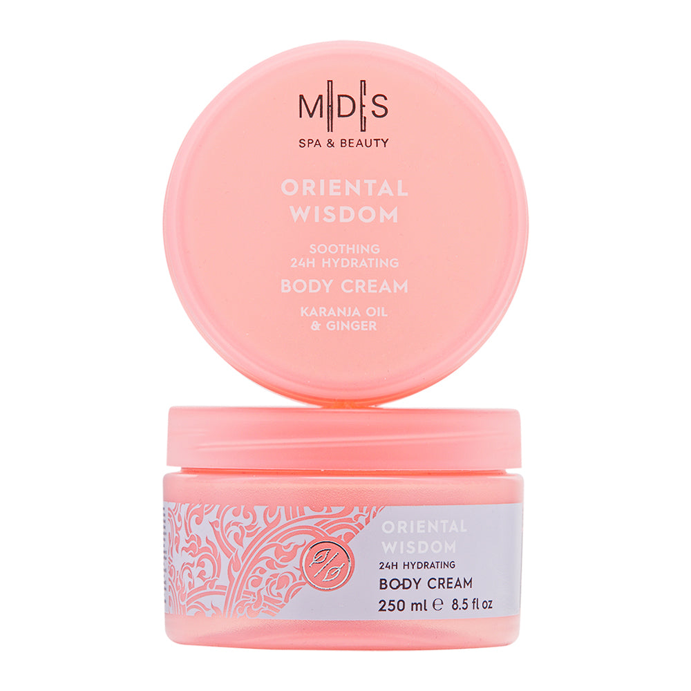 Надзвичайно зволожуючий крем для тіла тривалої дії (до 24 годин зволоження) Oriental Wisdom Body Cream ("Мудрість Сходу") з колекції Spa & Beauty від Mades Cosmetics – це насичений поживний косметичний засіб, у складі якого використовуються олії з аюрведичної практики, а також цінні рослинні екстракти: олії караньї, макадамії, шорея, кокоса, екстракти кардамону й імбиру. Інноваційна формула крему насичує шкіру вологою й утримує її тривалий час, а також пом'якшує, розгладжує та живить дерму. Вишуканий аромат оточує тіло солодким ароматом балінезійського кокоса та загадкового сандалового дерева. Продукт не містить силіконів і агресивних консервантів. Рекомендується для всіх типів шкіри, особливо буде корисним для чутливої шкіри.