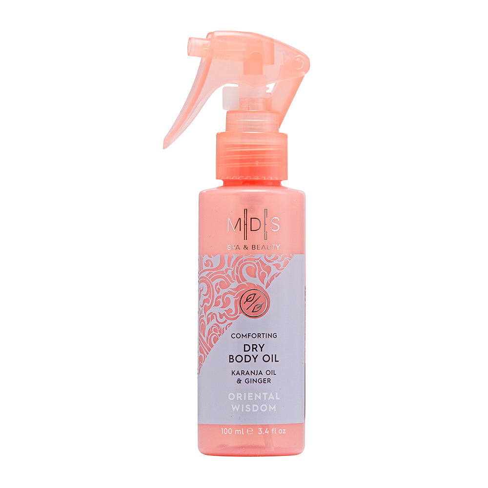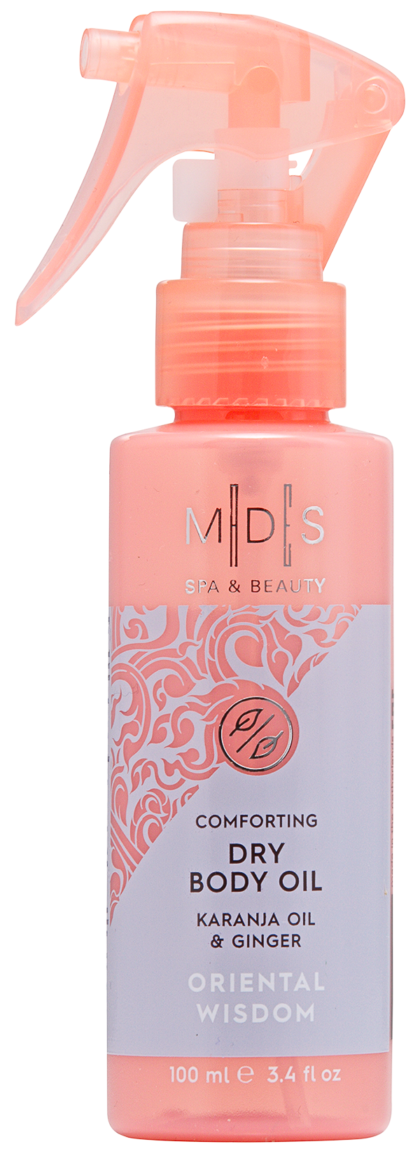 Запашна олія-спрей для тіла Oriental Wisdom Dry Body Oil ("Мудрість Сходу") з колекції Spa & Beauty від Mades Cosmetics – неймовірний б'юті-продукт, який має здатність швидкого вбирання й глибокої ароматизації шкіри. Коктейль цінних олій караньї горіха макадамії, кокоса, які входять до формули продукту, традиційно пов'язаний з аюрведичною медициною. Такий натуральний склад дає оптимальне живлення й зволоження шкіри, підвищує її захисні властивості, дарує еластичність та бездоганну гладкість. Олія не містить силікону і шкідливих агресивних компонентів. Засіб забезпечує потужну пом'якшувальну, делікатну регенерувальну та чудову освіжаючу дію. Також приємним доповненням до його функціональних властивостей є п'янкий вишуканий аромат, який чудово підіймає настрій.