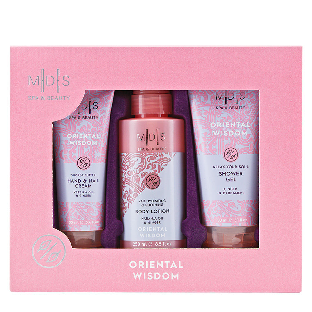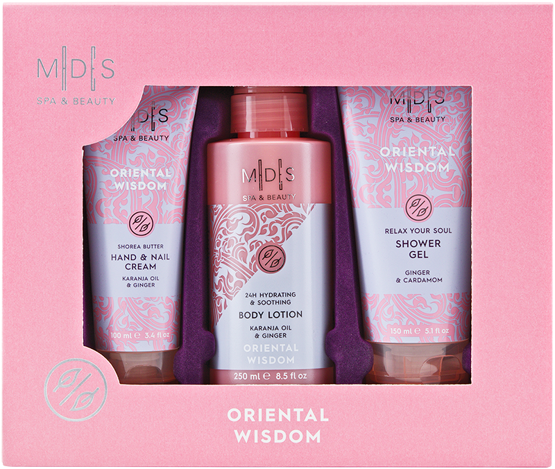 Подарунковий набір: гель для душу, лосьйон для тіла, крем для рук та нігтів ORIENTAL WISDOM aloe vera & ginger & cardamom