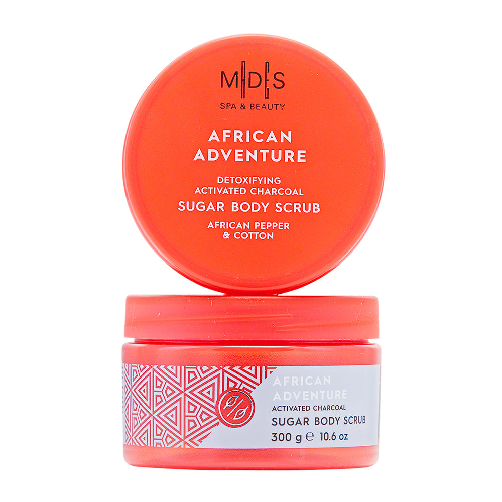Скраб для тіла на основі коричневого цукру і активованого вугілля African Advanture Sugar Body Scrub (""Африканська Пригода"") з колекції Spa & Beauty від Mades Cosmetics майстерно поєднав у собі сучасні, прогресивні технології та давні арома-традиції. Засіб ретельно і водночас дбайливо очищає шкіру, не залишаючи на тілі механічних пошкоджень. Професійний продукт також збагачений живильним маслом ши, пом'якшувальним екстрактом бавовни і зміцнювальним африканським перцем. Скраб сприяє поліпшенню мікроциркуляції крові, нормалізує перебіг обмінних процесів, підсилює прилив кисню в глибокі шари шкірного покриву, вирівнює його мікрорельєф і колір. Неймовірна бюті-знахідка стимулює вироблення колагену, підтримує життєвий тонус епідермального шару, підсилює його бар'єрну функцію і надає бажаної пружності. Коричневий цукор, як пілінгувальний компонент, забезпечує максимально м’яке та безпечне скрабування шкіри. Під час процедури піщинки цукру тануть і зменшуються у розмірі, завдяки чому досягається плавний перехід від інтенсивного пілінгу, до ніжного очищення. А дивовижний аромат приємно переливається чуттєво-проникливими фруктово-квітковими мотивами і огортає тіло на довгий час.