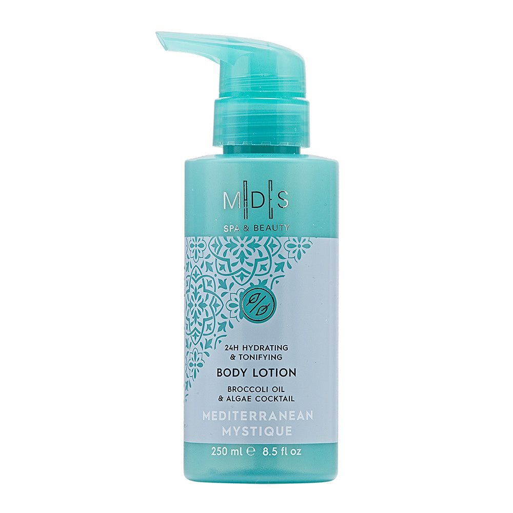 Вишуканий зволожуючий та тонізуючий лосьйон для тіла тривалої дії (до 24 годин зволоження) Mediterranean Mystique Body Lotion 24h Hydrating & Tonifying ("Таємниче Середземномор'я") з колекції Spa & Beauty від Mades Cosmetics забезпечує оптимальне живлення, надзвичайне зволоження, захист епідермісу, а також має гарну тонізуючу дію. Косметичний продукт багатий на цінні натуральні компоненти: олія з насіння броколі (насичені жирні кислоти, що надають поживні та реструктуруючі властивості), олія виноградних кісточок (унікальний рослинний компонент, який має виражену силу омолодження і оздоровчого впливу на епідерміс), коктейль морських водоростей, що надає шкірі шовковистість, гладкість і здорове сяйво. Mediterranean Mystique Body Lotion не містить силіконів і агресивних консерванті. Рекомендується для всіх типів шкіри. Чуттєвий засіб оточує тіло запашним ароматом квітучого Середземномор'я, що дарує енергійний заряд свіжості і легкості на цілий день.