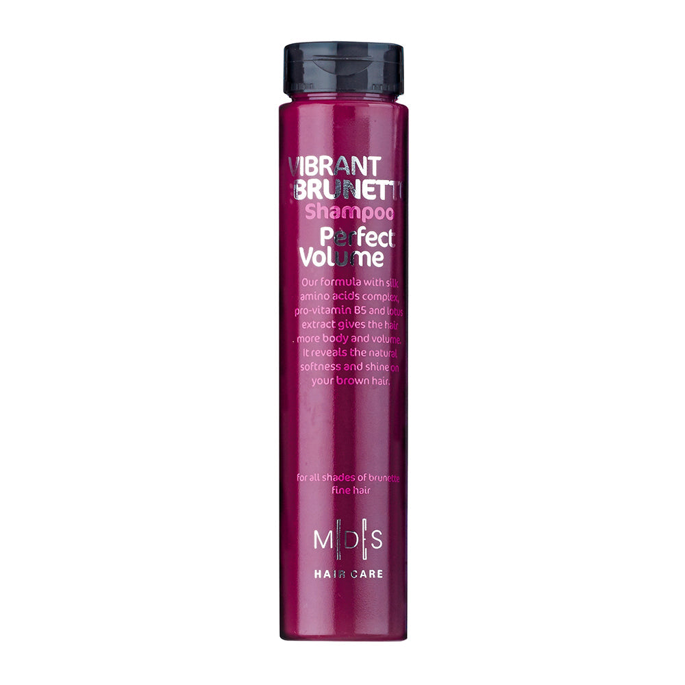 Неймовірний натуральний шампунь, що бездоганно доглядає за темним волоссям і надає йому ідеальний об'єм, Vibrant Brunette Perfect Volume Shampoo («Таємнича брюнетка. Ідеальний Об'єм») з колекції Hair Care від Mades Cosmetics відрізняється м'яким впливом на шкіру голови та волосся завдяки відсутності у складі агресивних компонентів. Професійний засіб має не тільки чудові очищаючі властивості, але й забезпечує навіть тонкому волоссю чудовий прикореневий об'єм. Цінність шампуню базується на неймовірних властивостях комплексу амінокислот шовку, провітаміну В5, екстрактів лотосу, хни, шовкового дерева та рожевого перцю. Vibrant Brunette Perfect Volume Shampoo допомагає відтворити здорову структуру волосся, робить його міцнішим, відчутно товщим і об'ємним. Добре зволожені, блискучі й еластичні локони з чудовим прикореневим об’ємом будуть безмежно радувати як натуральних брюнеток, так і дівчат, що досягли бажаного тону завдяки фарбуванню.