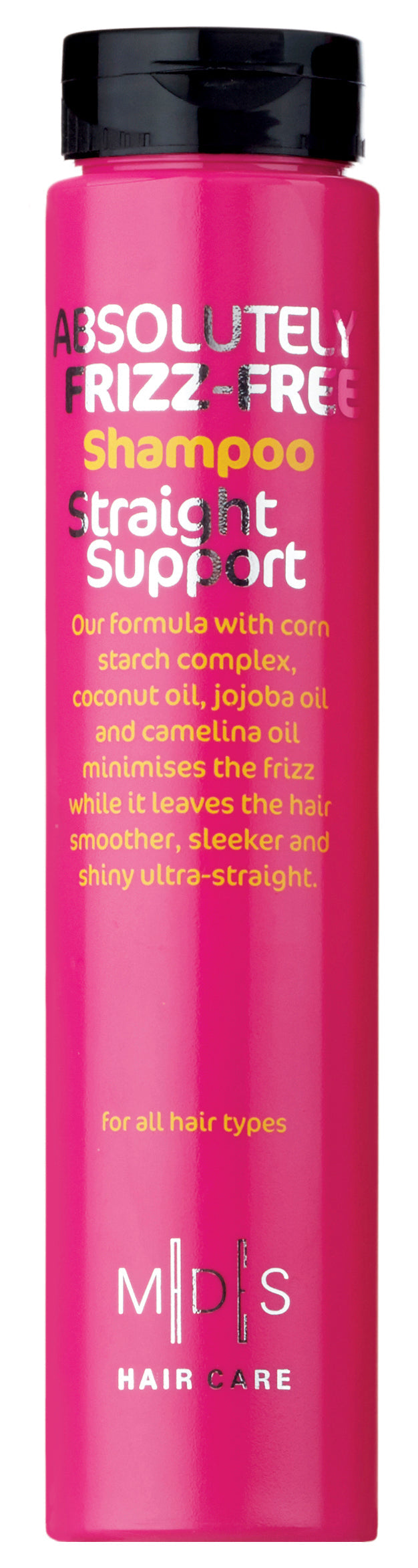 1. Інноваційний шампунь, що робить волосся прямим і шовковистим, Absolutely Frizz-free Shampoo Straight Support («Ідеально прямі») з колекції Hair Care від Mades Cosmetics – неймовірна сучасна б'юті-знахідка. Власниці в’юнкого, непокірного волосся знають, як іноді буває складно підібрати ефективний засіб для догляду за своїми локонами, здатний робити волосся м'яким і слухняним. Також дівчата із прямим, жорстким і примхливим волоссям зазнають труднощів при доборі засобу для укладання пасом. Оптимальним вибором в обох випадках стане шампунь Absolutely Frizz-free Shampoo Straight Support, призначений для догляду за прямим і кучерявим волоссям. Професійний продукт не лише ефективно усуває із поверхні волосся та шкіри голови усі забруднення, а й сприяє розгладженню та вирівнюванню пасом і дарує локонам м'якість і бездоганну шовковистість. До складу інноваційної формули входить кукурудзяний крохмаль, олія жожоба, кокосова та рижієва олії. Діючи у комплексі, цілющі компоненти розгладжують волосини та повертають пасмам природний блиск і слухняність.