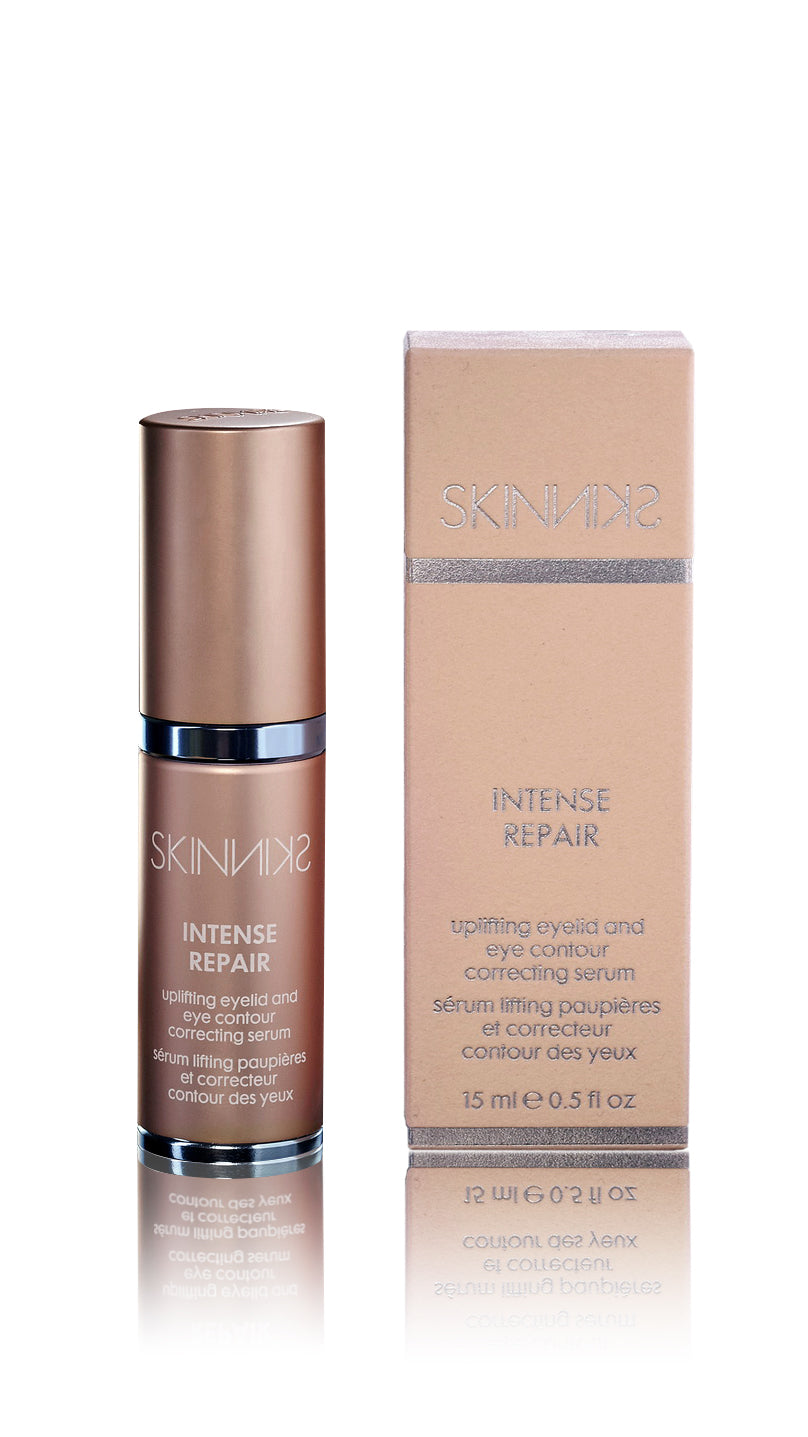 2. Навколо очей нанесіть сироватку Uplifting Eyelid and Contour Correcting Serum з колекції Intense Repair серії Skinniks від Mades Cosmetics, після чого зміцніть шкіру навколо очей кремом Advanced Anti-wrinkle Eye Cream з колекції Intense Repair серії Skinniks від Mades Cosmetics.
